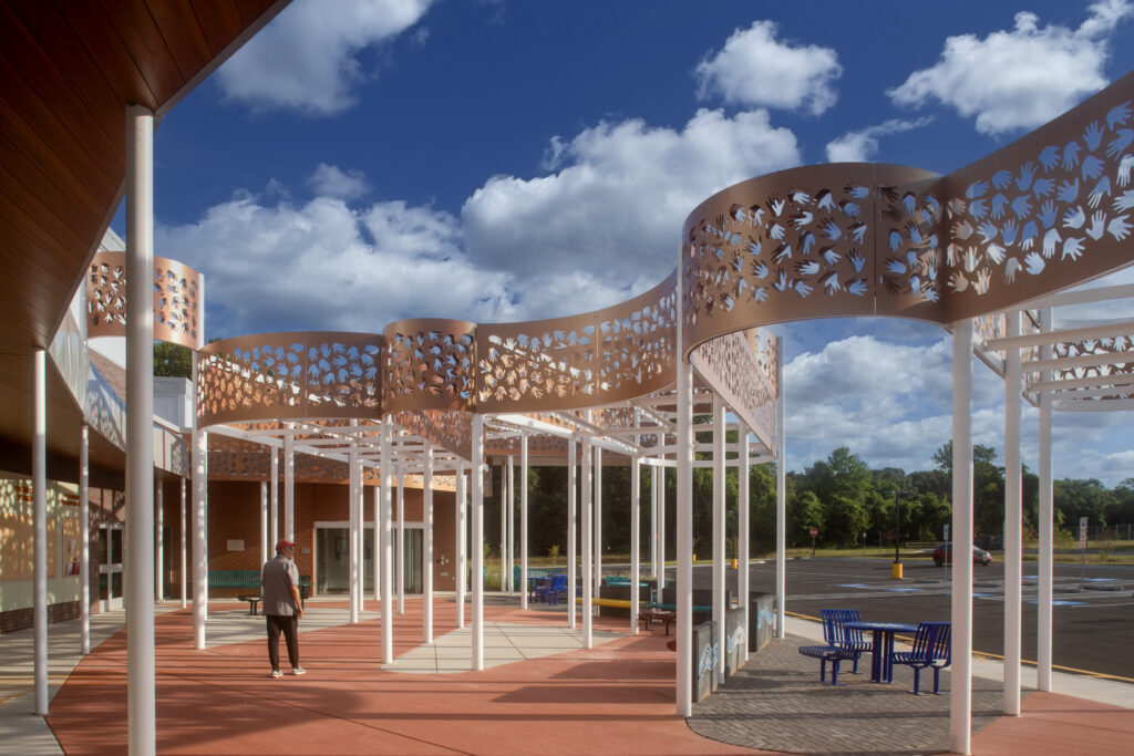 The exterior space is designed to be open to the community with a welcoming and clearly defined accessible path with seating, plantings, and outdoor public art and flexible performance space. There are opportunities for community programming to serve a wide range of ages as well, through partnerships with other County service providers, such as the Department of Recreation and Parks, Workforce Development and the Health Department. There are also opportunities for future outdoor amenities, including community gardens and intergenerational exercise stations.
